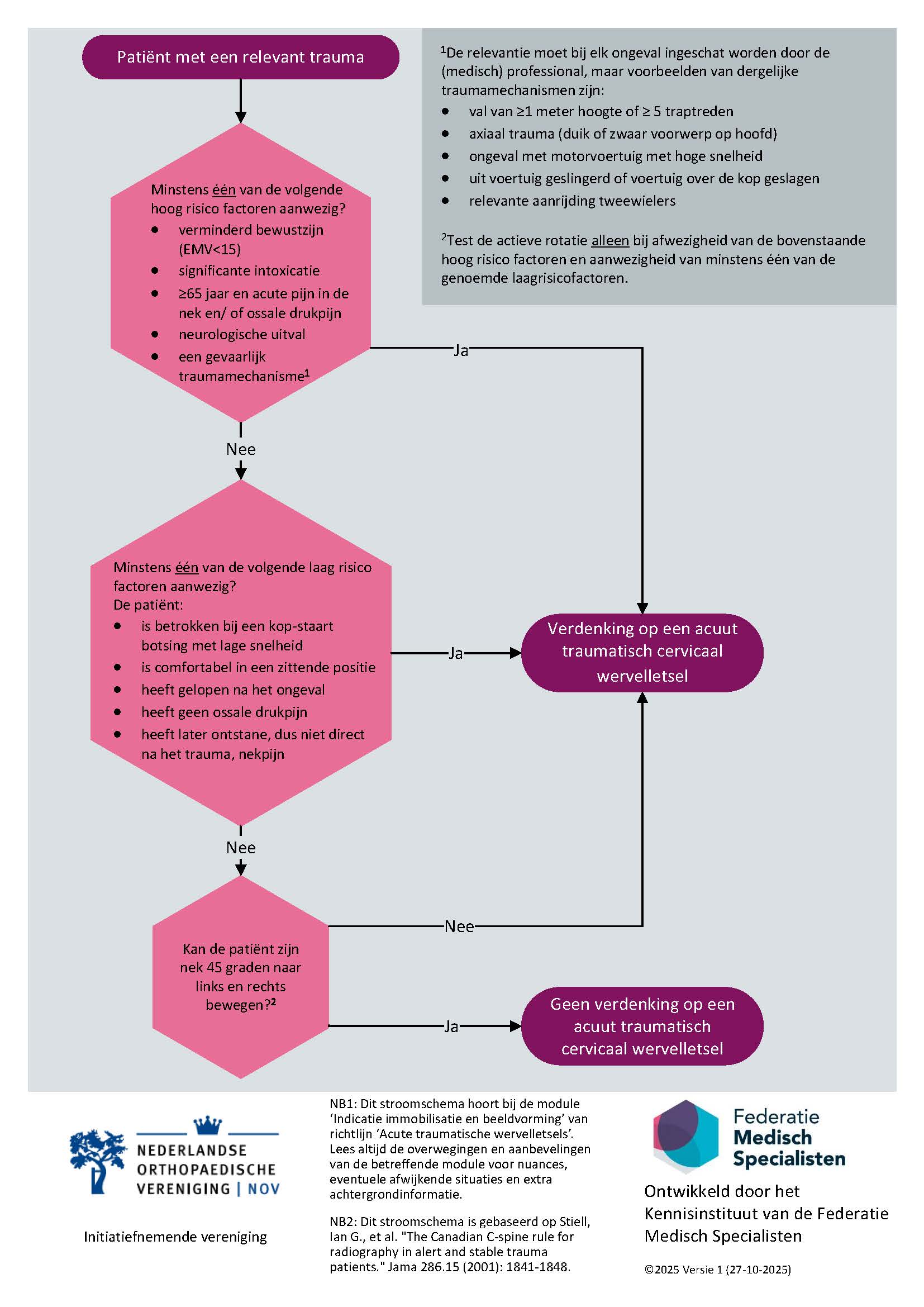 Immobiliseer een patiënt die verdacht wordt van het hebben van een cervicaal acuut traumatisch wervelletsel. Gebruik het stroomschema om te bepalen er sprake is van een verdenking op een acuut traumatisch cervicaal wervelletsel.