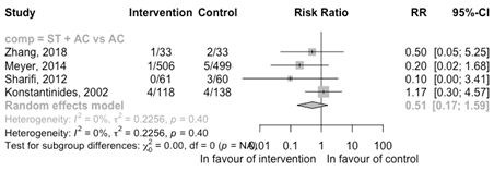 ST + AC vs AC The evidence is very uncertain about the effect of ST + AC on recurrence of pulmonary embolism when compared with AC in patients with acute intermediate-high risk PE.