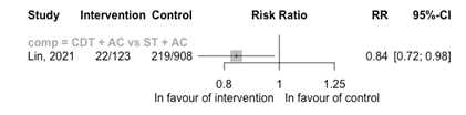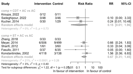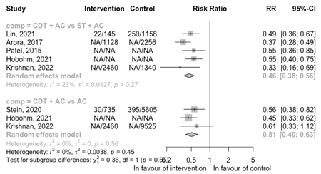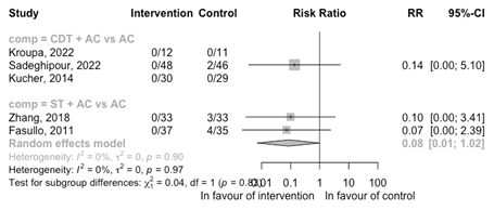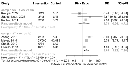 Planer and colleagues (Planer, 2023) undertook a systematic review into therapeutic options for patients with intermediate or high-risk PE. Anticoagulation, ST, and CDT were considered as treatment options. The authors searched multiple databases from inception to 18 October 2022. RCTs, cohort studies, and case-control studies were included if patients presented with intermediate or high-risk PE and a comparison between the stated treatment options was made.