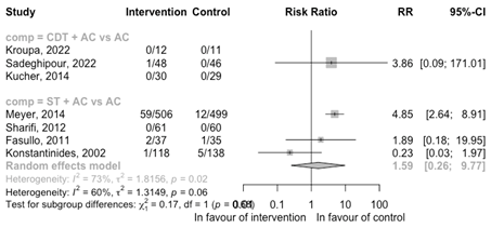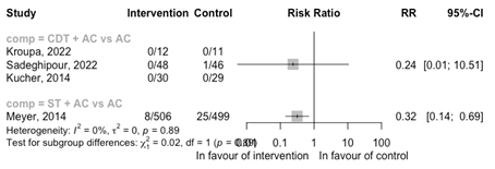 Major bleeding events The evidence is very uncertain about the effect of CDT or ST on major bleedings when compared with AC in patients with acute intermediate-high risk PE.