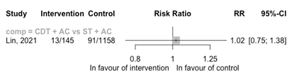 CDT + AC vs AC The evidence is very uncertain about the effect of CDT + AC on hemodynamic deterioration when compared with AC in patients with acute intermediate-high risk PE.