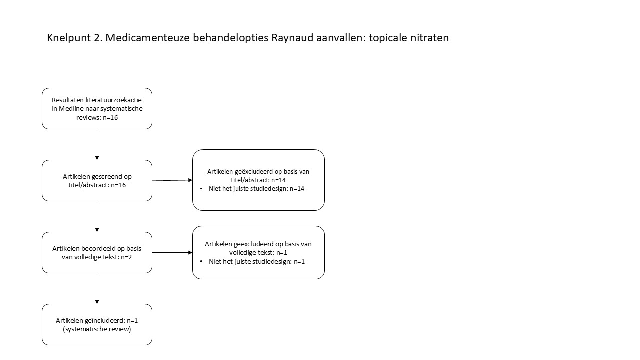 Patiënten of populatie: Patiënten met het secundair fenomeen van Raynaud Setting: (Poli)klinisch Interventie: Topicale nitraten Controle: Placebo |