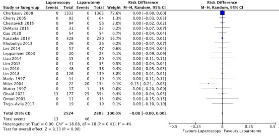 Wang (2022) performed a systematic review and meta-analysis to assess the value of diagnostic and therapeutic laparoscopy for patients with blunt or penetrating abdominal trauma. The databases PubMed, Embase and The Cochrane Library were searched for comparative studies on the effectiveness and safety of laparoscopy versus laparotomy for the management of abdominal trauma, published until the 30th of June 2021. The search resulted in 1358 studies of which 23 studies were included in the review. Comparative studies comparing laparoscopy with laparotomy for the management of abdominal trauma were selected. Studies in children (<18 years) were excluded). The 23 included studies encompassed one RCT (Leppaniem and Haapiainen, 2003), two prospective observational studies (DeMaria, 2000; Karateke, 2013), and twenty retrospective observational studies, of which four studies were controlled pre- post studydesigns (Cherkasov, 2008; Lee, 2014; Lin, 2010; Omori, 2003) and sixteen studies had a parallel design (Birindelli, 2021; Chakravartty, 2017; Cherry, 2005; Gao, 2020; Huang, 2017; Khubutiya, 2013; Liao, 2014; Lim, 2015; Lin 2018; Marks, 1997; Miles, 2004; Mutter, 1997; Obaid, 2021; Shams and Elaysi, 2021; Trejo-Avila, 2017). Baseline characteristics of the included studies and patients is presented in Table 1. The study populations of the included studies had both blunt and/or penetrating abdominal trauma. In six of the 23 studies, patients with only penetrating trauma were included (total number of patients n = 3309) and in four of the 23 studies, patients with only blunt trauma were included (total numer of patients n = 445). In ten studies patients with both penetrating and blunt injury were included (number patients not specified), or it was not stated if patients had blunt or penetrating injury. In all except two studies, the study population was hemodynamically stable (Cherkasov, 2008; Chestovich, 2015). The patient age varied from 26 to 57 years, with a 76.9% male population. Outcomes that were reported in the review were conversion from laparoscopy to laparotomy, missed injuries, mortality and complications (wound infection, intra-abdominal abscess, pneumonia, thromboembolism, bowel obstruction or ileus). Risk of bias of the individual studies was assessed with the Cochrane Collaboration’s tool (for the RCTs) and the NewCastle Ottawa Scale (for cohort studies).