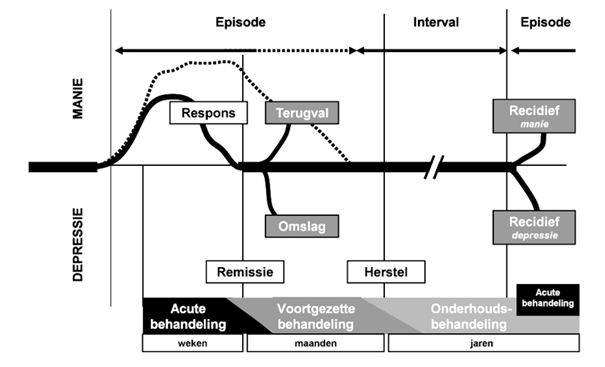 Getoond is de acute manie; voor depressie geldt dezelfde terminologie. De stippellijn geeft het veronderstelde onbehandelde (‘natuurlijke’) beloop van de episode weer.