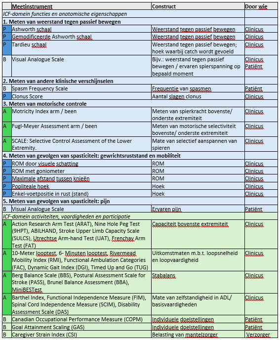 Het bovenste gedeelte (blauw) betreft het ICF-domein functies en anatomische eigenschappen, het onderste gedeelte (groen) betreft het ICF-domein activiteiten en participatie. De letters in de eerste kolom geven aan of het meetinstrument in het passieve domein (P), in het actieve domein (A), of in beide domeinen (B) toegepast kan worden.