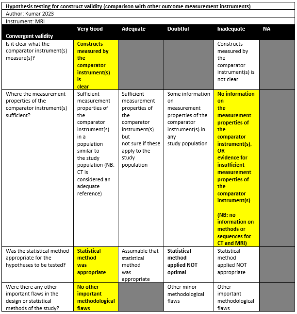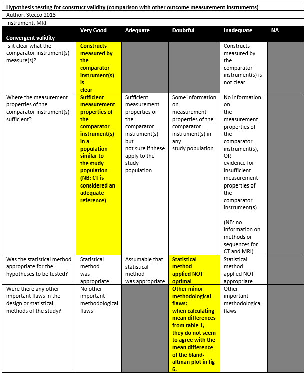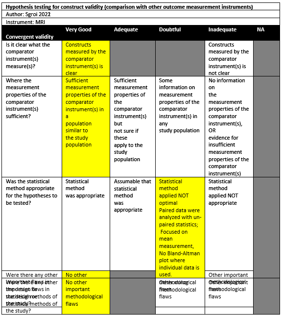 Voor oppervlakte-gebaseerde meetmethoden zijn wij echter zeer onzeker over de overeenkomst tussen metingen verricht op MRI en CT-beelden. Dit kwam met name doordat de twee grootste studies met deze meetmethoden elkaar tegenspraken (d.w.z. wel een significant versus geen significant verschil tussen gemiddelde metingen) en het risico op vertekening van de resultaten binnen studies. De enige studie die correlatiecoëfficiënten en 95%LoAs rapporteerde had binnen deze studie ook enigszins tegensprekende resultaten (Lansdown, 2019) waarbij het interval van de 95%LoAs van twee beoordelaars niet met elkaar overeen lijken te komen. Hierbij waren de intraclass correlatiecoëfficiënten voor correlatie tussen de modaliteiten weliswaar redelijk vergelijkbaar, maar overschreden de 95%LoAs van één van de beoordelaars de 5% (-4.9% tot 5.9%) terwijl de 95%LoAs van de tweede beoordelaar ruim onder de 5% bleven (-0.8% tot 0.9% en -1.9% tot 2.6%, respectievelijk). Studies gebruikten onderling veelal verschillende rekenmethoden om het botverlies mee te bepalen.