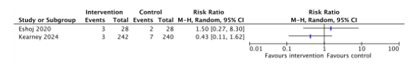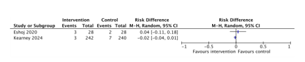 - Imprecisie: onnauwkeurigheid, omdat het betrouwbaarheidsinterval de grens/grenzen van klinische relevantie overschrijdt, en vanwege een zeer klein aantal events.