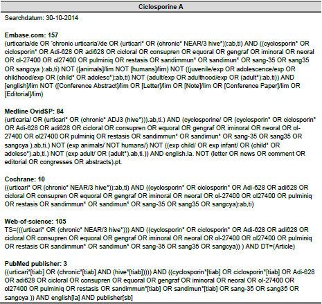 Per uitgangsvraag werd een systematische search verricht in de databases PubMed, de Cochrane Database of Systematic Reviews en Cochrane Central Register of Controlled Trials), tenzij anders aangegeven. Ook werden relevante nationale en internationale richtlijnen aangaande chronische urticaria geraadpleegd, met name de recente internationale richtlijn ‘EAACI / GA2LEN / EDF / WAO guideline on urticaria, 2014’, ontwikkeld volgens AGREE methode, en de Amerikaanse richtlijn ‘The diagnosis and management of acute and chronic urticaria: 2014 update’ (Bernstein et al., 2014; Zuberbier et al., 2014). De zoekstrategie en resultaten van de searches zijn terug te vinden onder Zoekverantwoording en Evidencetabellen.