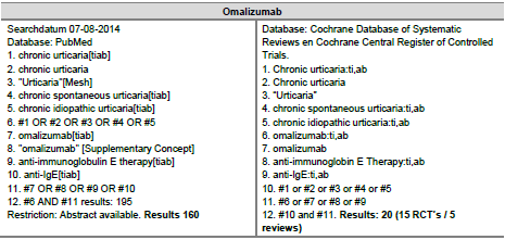 Per uitgangsvraag werd een systematische search verricht in de databases PubMed, de Cochrane Database of Systematic Reviews en Cochrane Central Register of Controlled Trials), tenzij anders aangegeven. Ook werden relevante nationale en internationale richtlijnen aangaande chronische urticaria geraadpleegd, met name de recente internationale richtlijn ‘EAACI / GA2LEN / EDF / WAO guideline on urticaria, 2014’, ontwikkeld volgens AGREE methode, en de Amerikaanse richtlijn ‘The diagnosis and management of acute and chronic urticaria: 2014 update’ (Bernstein et al., 2014; Zuberbier et al., 2014). De zoekstrategie en resultaten van de searches zijn terug te vinden onder Zoekverantwoording en Evidencetabellen.