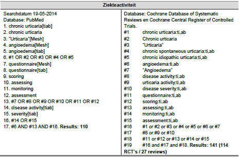 Per uitgangsvraag werd een systematische search verricht in de databases PubMed, de Cochrane Database of Systematic Reviews en Cochrane Central Register of Controlled Trials), tenzij anders aangegeven. Ook werden relevante nationale en internationale richtlijnen aangaande chronische urticaria geraadpleegd, met name de recente internationale richtlijn ‘EAACI / GA2LEN / EDF / WAO guideline on urticaria, 2014’, ontwikkeld volgens AGREE methode, en de Amerikaanse richtlijn ‘The diagnosis and management of acute and chronic urticaria: 2014 update’ (Bernstein et al., 2014; Zuberbier et al., 2014). De zoekstrategie en resultaten van de searches zijn terug te vinden onder Zoekverantwoording en Evidencetabellen.