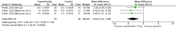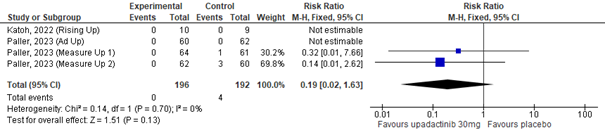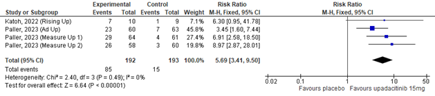 Voor de aanbevelingen over effectiviteit en veiligheid werd de kwaliteit van het bewijs beoordeeld op basis van een effectmaat afgeleid uit een meta-analyse (per uitkomstmaat) van 3 en waar mogelijk 4 verschillende RCT’s besproken in 2 studies (Katoh et al., 2022; Paller et al., 2023). Er werd per uitkomstmaat onderscheid gemaakt tussen 15 mg en 30 mg upadacitinib vs. placebo. Hoewel alle initiële RCT’s ook volwassenen includeerden zijn alleen de resultaten betreft de adolescenten meegenomen. De resultaten hebben betrekking op een placebo-gecontroleerde periode van 16 weken. Bij ‘Conclusies upadacitinib (kwaliteit van bewijs)’ is per uitkomstmaat op basis van de GRADE-beoordeling, waarbij de kwaliteit van de RCT’s (risk of bias) en het bewijs invloed hebben op de uiteindelijke formulering, een conclusie geformuleerd.