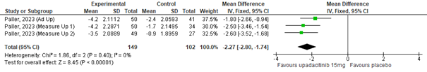 De kwaliteit van het bewijs voor de superieure effectiviteit van upadacitinib vs. placebo voor de uitkomstmaten vIGA-AD 0 of 1, EASI-75 en EASI-90 werd als hoog (GRADE) beoordeeld, en voor de uitkomstmaten WP NRS, POEM en de (C)DLQI werd de bewijskracht (GRADE) als redelijk (en voor sommige vergelijkingen hoog) beoordeeld. Betreft de veiligheid resulteert upadacitinib waarschijnlijk in meer TEAE’s t.o.v. placebo (GRADE: redelijk). Echter, betreft de ernstige TEAE’s en TEAE’s die leidden tot stopzetting, was het verschil niet significant en werd in beiden gevallen de bewijskracht als laag (GRADE) beoordeeld.