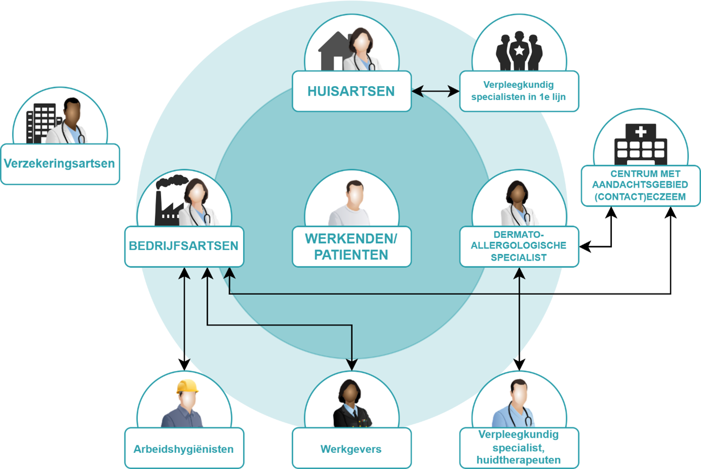 Een visualisatie van de zorgverleners die betrokken zijn bij de zorg rondom patiënten met werkgerelateerd contacteczeem is weergegeven in Figuur 1 ‘Overzicht organisatie van zorg bij (contact)eczeem’.