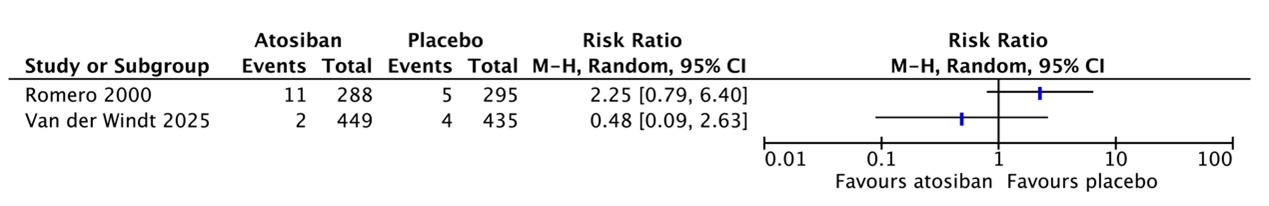 Van der Windt (2025) reported that 26 of the 449 infants (5.8%) whose mother received atosiban had culture proven neonatal sepsis as compared to 25 of the 435 infants (5.7%) whose mother received placebo (RR=1.01, 95%CI 0.59 to 1.72).
