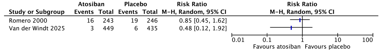 Van der Windt (2025) reported that 2 of the 449 infants (0.4%) whose mother received atosiban died (stillbirth and death until 28 days postpartum) as compared to 4 of the 435 infants (0.9%) whose mother received placebo (RR=0.48, 95%CI 0.09 to 2.63).