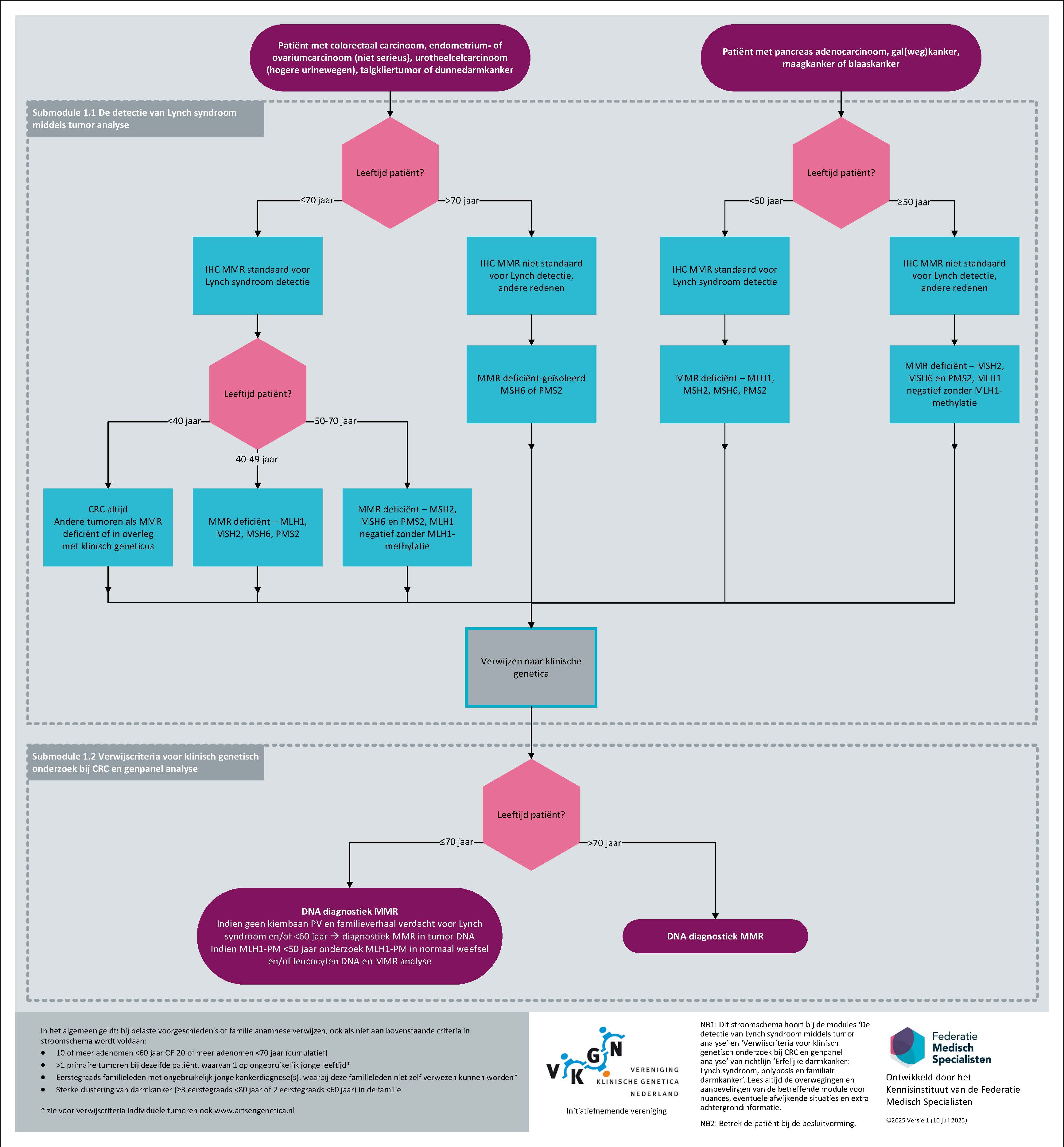 NB: omdat het aantonen van Lynch syndroom soms gevolgen kan hebben voor chirurgische behandelkeuzes (subtotale colectomie of segmentresectie en bij vrouwen eventueel gelijktijdige preventieve operatie van uterus en/of ovaria, zie submodule Chirurgische behandeling van Lynch syndroom), moet in deze gevallen patiënt met spoed worden verwezen naar de Klinische genetica.