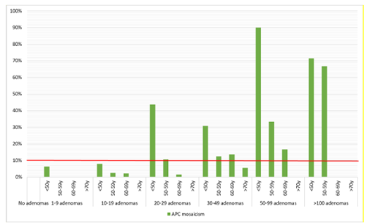 Verricht bij negatief kiembaanonderzoek APC-mozaïek analyse bij patiënten met: