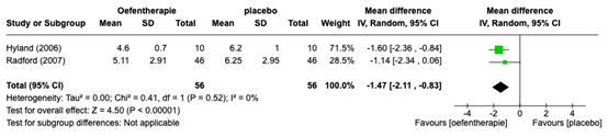 Hyland (2006), VAS 0-10 scale, reported a mean difference of -1.60(95% CI: -2.36 lower to -0.84 lower)