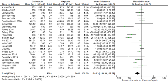 Carbetocin may result in a small reduction on total blood loss when compared with oxytocin in postpartum women.