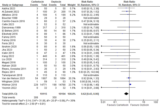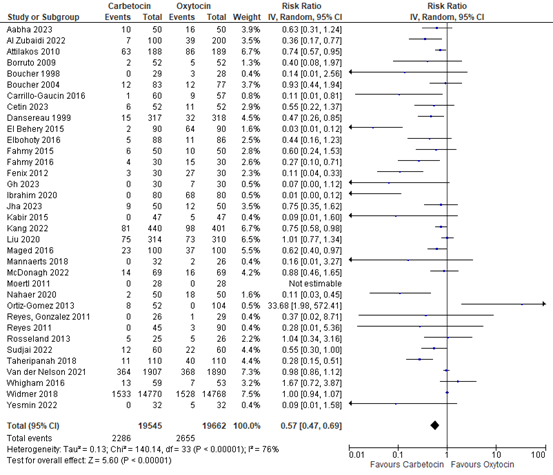 - Carbetocine versus oxytocine: carbetocine leidde , vergeleken met oxytocine, niet of nauwelijks tot een lager risico op bloedverlies postpartum ≥1L (RR 0.92 (95%CI 0.79 tot 1.06), low grade). Voor andere uitkomstmaten werd wel een verbetering gezien bij gebruik van carbetocine vergeleken met oxytocine: hoeveelheid bloedverlies -79 ml (95%CI -125 tot -33; low grade), additionele interventies RR 0.57 (95%CI 0.47 tot 0.69; low grade) en bloedtransfusie RR 0.62 (95%CI 0.43-0.90; moderate grade). In het optreden van bijwerkingen werden geen verschillen gezien (low grade).