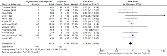 - Metylergometrine+oxytocine versus oxytocine: het combinatiepreparaat syntometrine leidde, vergeleken met alleen oxytocine tot een lager risico op bloedverlies ≥1L (RR 0.74 (95%CI 0.57 tot 0.96), moderate grade). Voor de uitkomstmaten hoeveelheid bloedverlies en bloedtransfusie werden geen verschillen gevonden (low tot very low grade), en het risico op additionele interventies leek lager bij het combinatiepreparaat (RR 0.75 (95%CI 0.60-0.94; very low grade). Het combinatiepreparaat gaf een iets hoger risico op misselijkheid en braken vergeleken met alleen oxytocine (low grade).