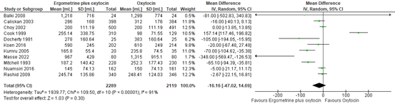 Methylergometrine may result in little to no difference on total blood loss when compared with oxytocin in postpartum women.