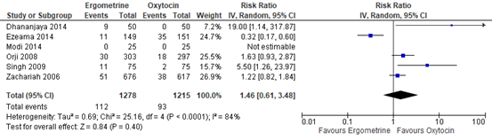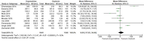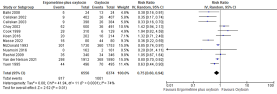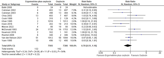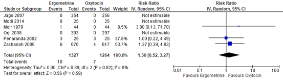 - Methylergometrine versus oxytocine: methylergometrine leidde, vergeleken met oxytocine, niet tot een lager risico op bloedverlies postpartum ≥1L (RR 1.30 (95%CI 0.52 tot 3.27), very low grade). Voor de uitkomstmaten hoeveelheid bloedverlies, additionele interventies en bloedtransfusie werden ook geen verschillen gevonden (low to very low grade), terwijl het risico op bijwerkingen bij behandeling met methylergometrine iets verhoogd leekvergeleken met oxytocine (low grade).