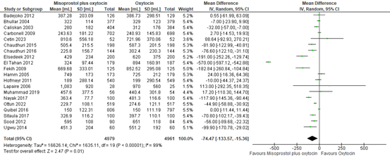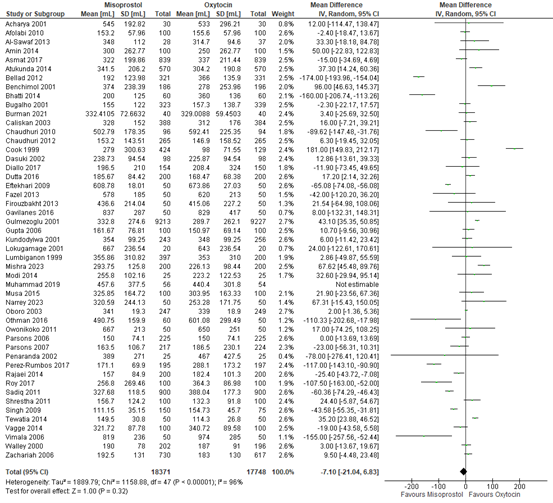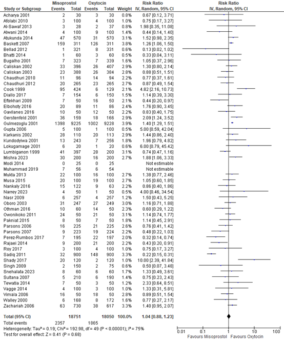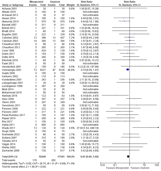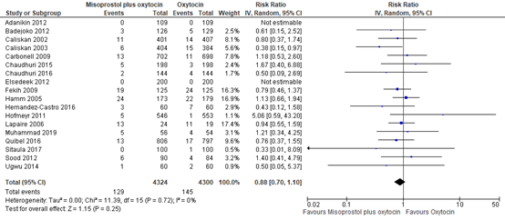 Source: Acharya 2001, Afolabi 2010, Al-Sawaf 2013, Alwani 2014, Atukunda 2014, Baskett 2007, Bellad 2012, Bhatti 2014, Bugalho 2001, Caliskan 2002, Caliskan 2003, Chaudhuri 2010, Chaudhuri 2012, Cook 1999, Diallo 2017, Eftekhari 2009, Elbohoty 2016, Gavilanes 2016, Gerstenfeld 2001, Gulmezoglu 2001, Gupta 2006, Karkanis 2002, Kundodyiwa 2001, Lokugamage 2001, Lumbiganon 1999, Mishra 2023, Modi 2014, Mukta 2013, Musa 2015, Nankaly 2016, Narrey 2023, Oboro 2003, Othman 2016, Owonikoko 2011, Pakniat 2015, Parsons 2006, Parsons 2007, Perez-Rumbos 2017, Rajaei 2014, Roy 2017, Sadiq 2011, Shady 2017, Singh 2009, Snehalata 2023, Sultana 2007, Tewatia 2014, Vagge 2014, Vimala 2006, Walley 2000, Zachariah 2006. |