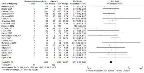 - Misoprostol+oxytocine versus oxytocine: het combineren van misoprostol met oxytocine, vergeleken met alleen oxytocine, leidde tot een lager risico op bloedverlies ≥1L (RR 0.88 (95%CI 0.70 tot 1.10; moderate grade). Voor de andere uitkomstmaten werd een verbetering gezien in het voordeel van de combinatie misoprostol+oxytocine: -75 ml bloedverlies (95%CI -134 tot -15; moderate grade), additionele interventies RR 0.57 (0.47 tot 0.69; high grade) en bloedtransfusie RR 0.51 (0.39 tot 0.68; low grade). Bij de combinatie van misoprostol met oxytocine leken er meer bijwerkingen op te treden vergeleken met alleen oxytocine (low grade).