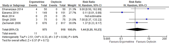 The evidence is very uncertain about the effect of methylergometrine on the risk of blood loss ≥1000mL when compared with oxytocin in postpartum women.
