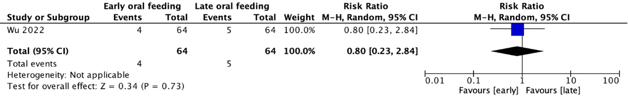 After our literature search one systematic review with a meta-analysis was found for PICO 1. Milinis (2021) performed a systematic review to investigate the effect of early (≤5 days) versus late (>5 days) initiation of oral feeding following total (pharyngo)laryngectomy. The authors searched databases Medline, EMBASE, clinicaltrials.gov, and the Cochrane Library databases until April 2020. Milinis (2021) included both RCTs and cohort studies, that investigated patients who underwent reconstruction with either regional (e.g., pectoralis major flap) or free flaps. Their search was limited to studies reported in the English language. Exclusion criteria of Milinis (2021) were: failure to report the rates of fistula formation, pediatric populations, duplicated and republicated studies and abstracts, inadequate sample size (n < 10), and studies which commenced early oral feeding after day 5. The primary study outcome was the incidence of fistula formation in the early feeding (≤5 days) group compared to the late feeding (>5 days) group. The secondary outcome was the length of hospital stay. For RCTs, the authors used the Cochrane risk of bias tool (RoB 1.0) to perform risk of bias assessment. For cohort studies, the Newcastle-Ottawa tool was used (Wells, 2013). In the review of Milinis (2021) a total of 374 studies were identified, of which 31 full text articles were screened. In total they included 4 RCTs and 10 cohort studies.