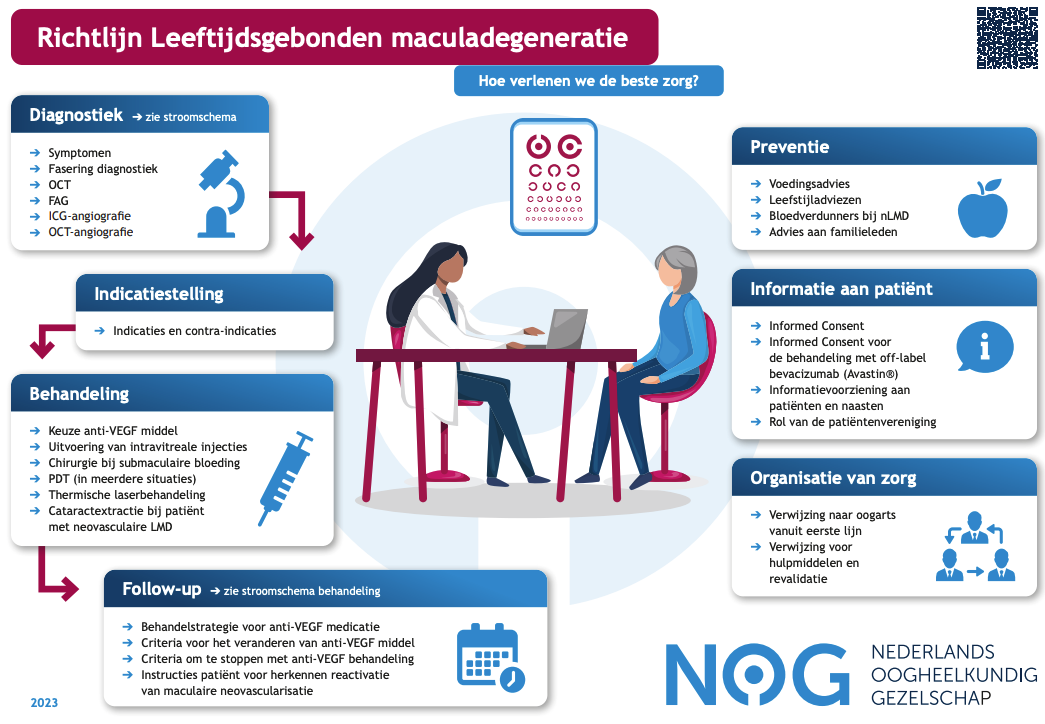 Deze richtlijn beschrijft hoe zorgverleners het beste patiënten met leeftijdsgebonden maculadegeneratie, indien nodig, kunnen behandelen en begeleiden. Dit advies is gebaseerd op de laatste wetenschappelijke inzichten. Het doel van de richtlijn is dat alle patiënten in Nederland dezelfde goede zorg krijgen. In de richtlijn wordt beschreven hoe de ziekte moet worden vastgesteld, wat de beste behandeling is en wanneer de behandeling in overleg met de patiënt kan worden gestopt. Er is vastgelegd hoe en wanneer de oogarts samen met de patiënt moet beslissen over start van behandeling en hoe lang de behandeling moet worden voortgezet. Beschreven wordt welke informatie moet worden verstrekt over hulpmiddelen en visuele revalidatie.