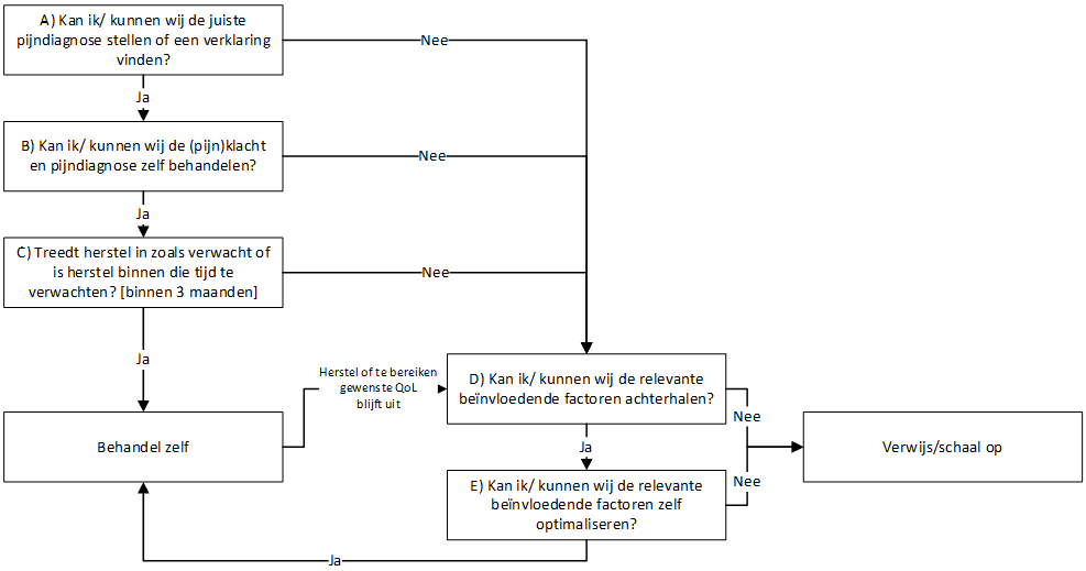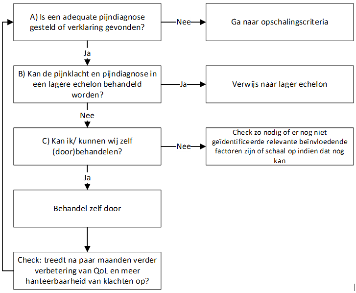 Het grootste deel van de patiënten zal in de nabije toekomst in de eerste (en anderhalve) lijn behandeld worden. Daar waar nodig kan echter aanvullende expertise, advies of onderzoek in de tweede lijn of derde lijn aangevraagd worden. Ook indien de complexiteit van de patiënt te hoog is, de ingezette therapie niet effectief is gebleken, er geen alternatieve adequate interventies binnen de competenties van de zorgprofessional zijn en/of er onvoldoende aansluiting is bij de hulpvraag of behoefte van de patiënt, moet opschaling overwogen worden. Figuur 3.1 geeft de kernvragen en globale stappen voor opschaling weer in geval aanhoudende pijn en/of toenemende afname van functioneren een probleem vormt.