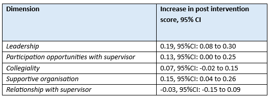 Kok (2023b) reported on Team climate using the Team Climate Inventory from the Safety Attitude Questionnaire, which contains six items with Likert scales ranging from completely disagree (0) to completely agree (4). Post intervention, team climate score did increase in favor of the intervention group (effect size: 0.03, 95%CI: −0.07 to 0.12). This difference was not considered clinically relevant.