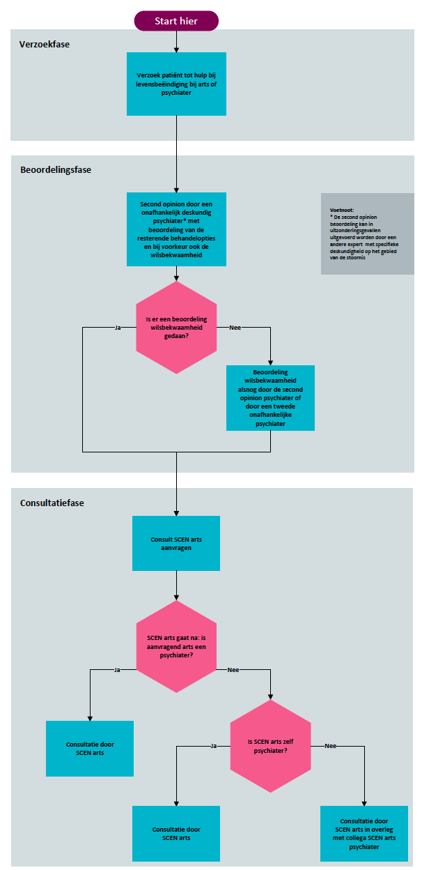 Indien uzelf geen psychiater bent, consulteert u altijd een psychiater die tevens de SCEN-opleiding heeft voltooid. Bent u zelf wel psychiater, dan kunt u ook volstaan met het consulteren van een reguliere SCEN-arts. Dit alleen indien de psychiater die de second opinion uitvoerde zowel de uitzichtloosheid van het lijden als de wilsbekwaamheid heeft beoordeeld.
