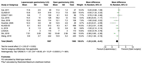 De opnameduur werd gerapporteerd in 11 studies. Het gemiddelde verschil was -1.25 (95% CI, -2.09 tot -0.41). Dit verschil werd als klinisch relevant beschouwd, ten gunste van laparoscopie.