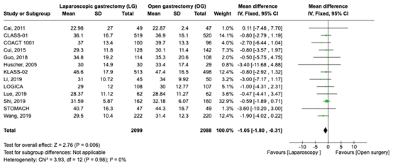Bij de belangrijke uitkomstmaten werd een klinisch relevant voordeel gezien voor de opnameduur: patiënten die laparoscopische chirurgie ondergingen verbleven gemiddeld 1,25 dagen korter in het ziekenhuis. Voor R0-resectie en lymfeklierretrieval werden kleine verschillen gerapporteerd, zonder klinische relevantie.