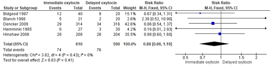 An Apgar score <7 at 5 minutes was found in 12/610 (2%) neonates in the immediate oxytocin group and in 11/590 (1.9%) neonates in the delayed oxytocin group (RR 1.02, 95%CI 0.46 to 2.28) (Figure 1). This difference was considered not clinically relevant.