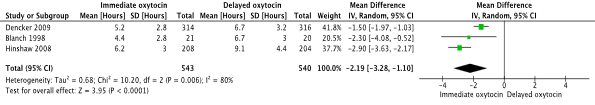 Bugg (2013) performed a systematic review and meta-analysis of the literature to determine if the use of oxytocin for the treatment of slow progress of labour in the first stage of spontaneous labour could have a positive effect on delivery outcomes and maternal and neonatal morbidity and mortality. The first comparison described in Bugg (2013) was intravenous oxytocin versus placebo/no treatment (not included in this literature analysis) and the second comparison was early use of intravenous oxytocin (immediate administration) versus delayed use of oxytocin (i.e. delayed by at least one hour). The Cochrane Pregnancy and Childbirth Group’s Trials Register (including trials identified from CENTRAL, MEDLINE, EMBASE, hand searches of 30 journals, major conferences and 44 journals from BioMed Central) was searched up to May 29th, 2013.