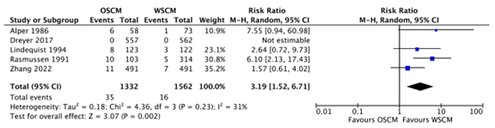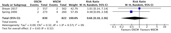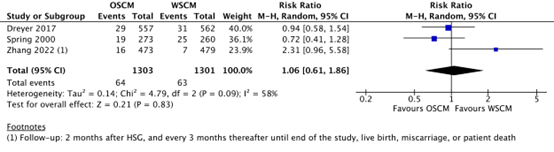 | 570 per 1000 | 621 per 1000 | Low Due to serious risk of bias, due to serious imprecision5 | The evidence suggests that OSCM results in little to no difference in ongoing pregnancy at 3 years after HSG when compared with WSCM in women of infertile couples (at low risk of tubal pathology) undergoing hysterosalpingography.