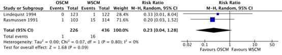 | 266 per 1000 | 346 per 1000 | Low Due to serious risk of bias, due to serious imprecision1 | OSCM may increase clinical pregnancy when compared with WSCM in women of infertile couples (at low risk of tubal pathology) undergoing hysterosalpingography.