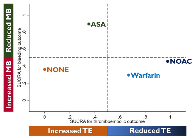 Daarnaast zijn er twee meta-analyses verschenen van de patiënten (zowel kinderen als volwassenen) met een Fontan circulatie (Van den Eynde, 2023; Sethasathien, 2024). In de meest recente meta-analyse wordt aangegeven dat DOACs het meest gunstige profiel hebben in de balans tussen voorkomen van trombose en het risico op (ernstige) bloedingen (zie figuur 1).