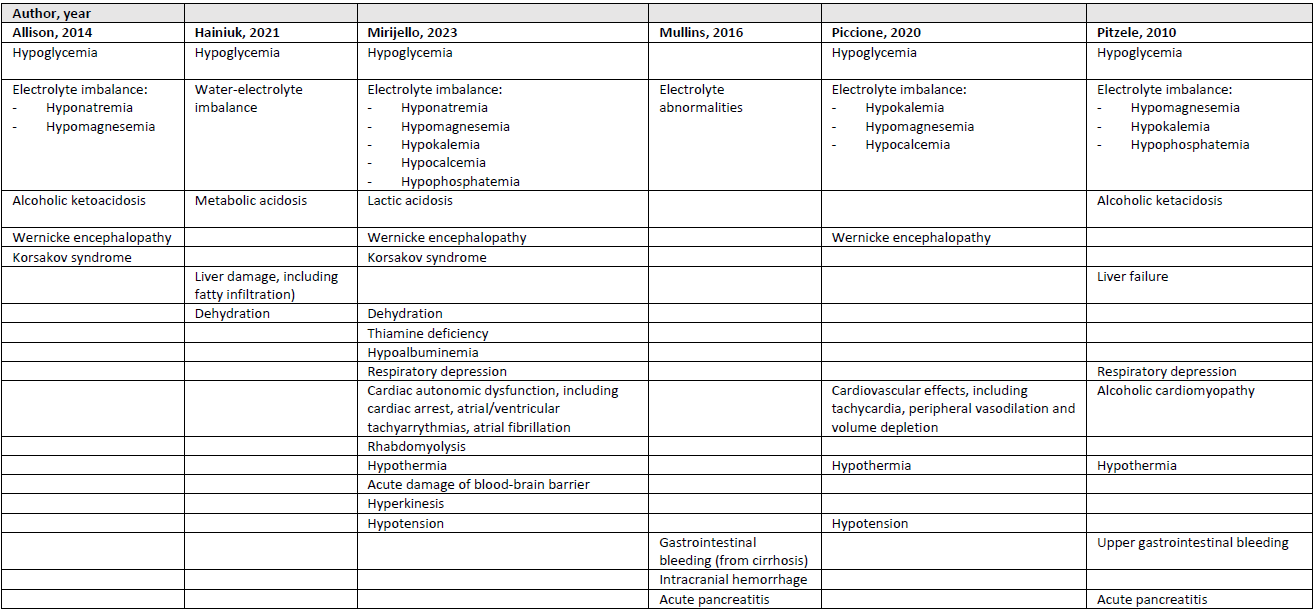Voor de module is, vanwege de formulering van de uitgangsvraag, systematisch gezocht naar systematische en narratieve reviews. In totaal zijn zes narratieve reviews geïncludeerd die rapporteren over klinische symptomen van acute alcoholintoxicatie, waarbij directe behandeling vereist is (Allison, 2014; Hainiuk, 2021; Mirijello, 2023; Mullins, 2016; Piccione, 2020; Pitzele, 2010). Vanwege het type geïncludeerde studies, is er geen GRADE beoordeling toegepast. Meermaals benoemde klinische symptomen in de studies zijn: hypoglycemie, verstoorde elektrolytenbalans, metabole acidose, Wernicke encefalopathie, syndroom van Korsakov, leverschade, uitdroging, ademhalingsdepressie, cardiale dysfuncties, onderkoeling, lage bloeddruk, gastro-intestinale bloedingen en acute pancreatitis. Daarnaast is een aantal symptomen in één van de reviews benoemd, waaronder rhabdomyolyse en intracraniële bloeding.