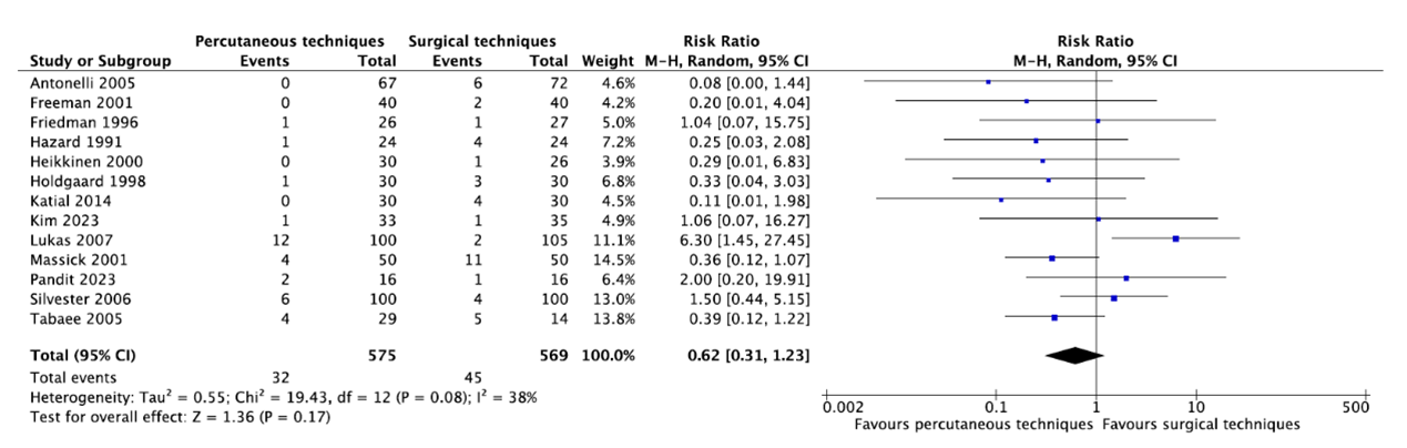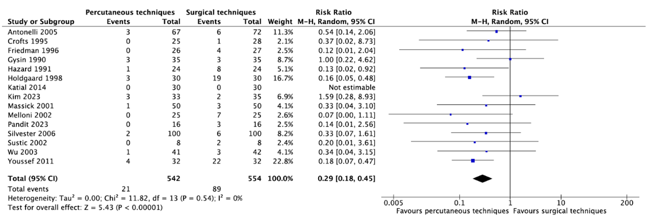 Kim (2023) reported a mean difference of 0.60 mL (95%CI -0.58 to 1.78) in procedure-related estimated blood loss in favor of surgical tracheostomy. Pandit (2023) reported a risk ratio of 0.91 (95%CI 0.55 to 1.50) for minimal peri-operative hemorrhage and a risk ratio of 1.20 (95%CI 0.46 to 3.15) for moderate peri-operative hemorrhage. |