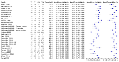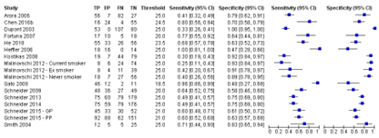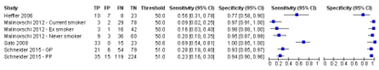 Gepoolde sensitiviteit 0,53 (95% BI; 0,44 to 0,62); gepoolde specificiteit 0,74 (95% BI; 0,65 tot 0,81)