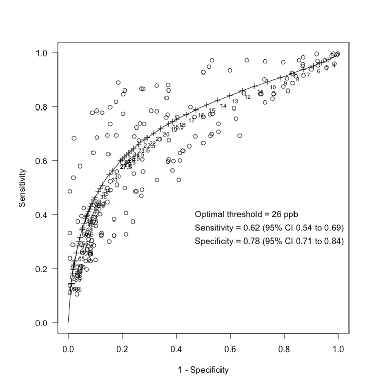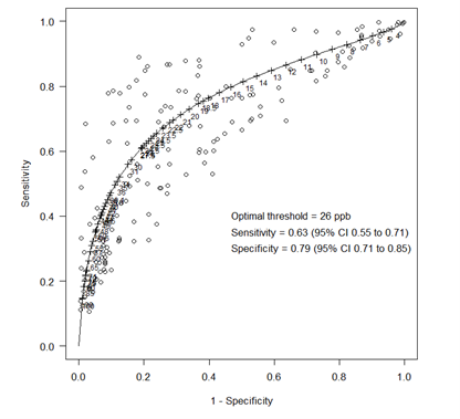 De gepoolde sensitiviteit bedroeg ongeveer 0.66 (95%; BI) en de gepoolde specificiteit 0.77 (95% BI) met een bijbehorende AUC van 0.786. De meeste van 27 verschillende onderzoeken hanteerden verschillende afkapwaarden (totaal 171), variërend van 1-20 afkapwaarden per onderzoek. Uit de analyse waarin de resultaten van alle 171 gerapporteerde waarden werd meegenomen kwam 26ppb als optimale afkapwaarden, derhalve is dat in de huidige richtlijn overgenomen. Daarbij werden nog naar additionele afkapwaarden gekeken.