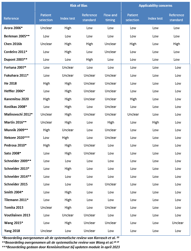 Tabel 3 geeft een overzicht van de kans op vertekening in de onderzoeken en applicability concerns (QUADAS-2). Vier onderzoeken scoorden een hoge kans op vertekening voor de selectie van patiënten, omdat patiënten niet consecutief geïncludeerd werden of omdat enkel niet-rokers werden geïncludeerd of deelnemers die alle diagnostische tests hadden ondergaan (He, 2018; Kanemitsu, 2020; Munnik, 2010; Pedrosa, 2010). Vanwege een selecte onderzoekspopulatie werd in twee gevallen de toepasbaarheid als laag beoordeeld (Chen, 2016; Kanemitsu, 2020). De kans op vertekening betreffende de indextest werd als hoog ingeschat voor zestien onderzoekendoor het ontbreken van een vooraf gedefinieerde FeNO afkapwaarde en/of vanwege de interpretatie van FeNO-waarde met kennis van de uitslag van de referentiestandaard. Vanwege een suboptimale referentiestandaard (bronchoprovocatie of bronchodilatatie) in één onderzoek (Chen, 2016) en het feit dat de FeNO-waarde bekend was bij de interpretatie van de referentiestandaard in een ander onderzoek (Dupont, 2003) werd een hoge kans op vertekening betreffende de referentiestandaard gescoord en in één van de twee onderzoeken ook een verminderde toepasbaarheid31. Geen van de onderzoeken scoorde een hoge kans op vertekening voor het QUADAS-2-domein Flow and timing.