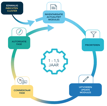 - Need-for-update fase: Inventariseren van de actualiteit van de modules binnen het cluster (1-2 maanden)